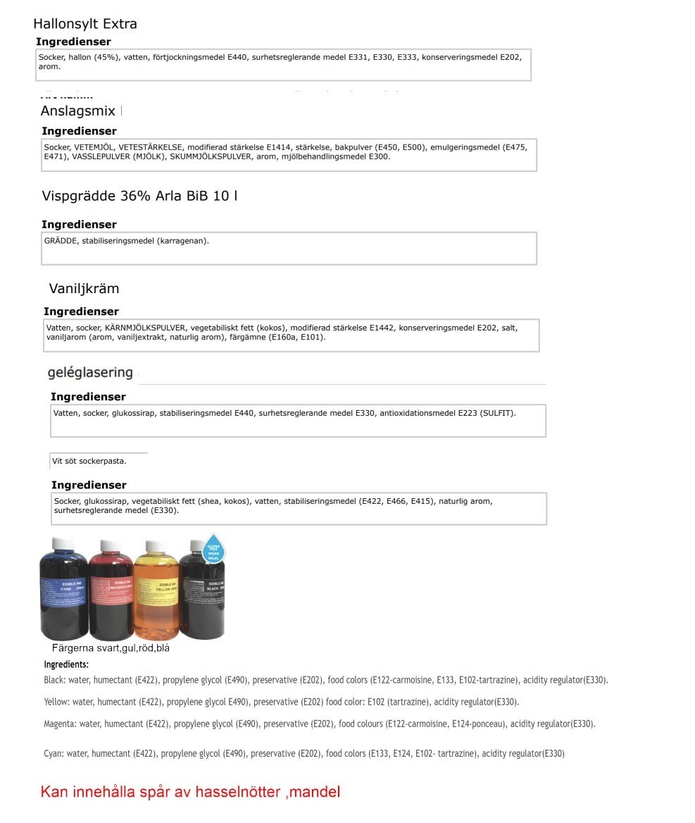 Sockerkaksbotten, hallonssylt, vaniljkräm, Arla grädde %36 fetthalt, smörkräm, sockerpasta och vatten baserade livsmedelfärger